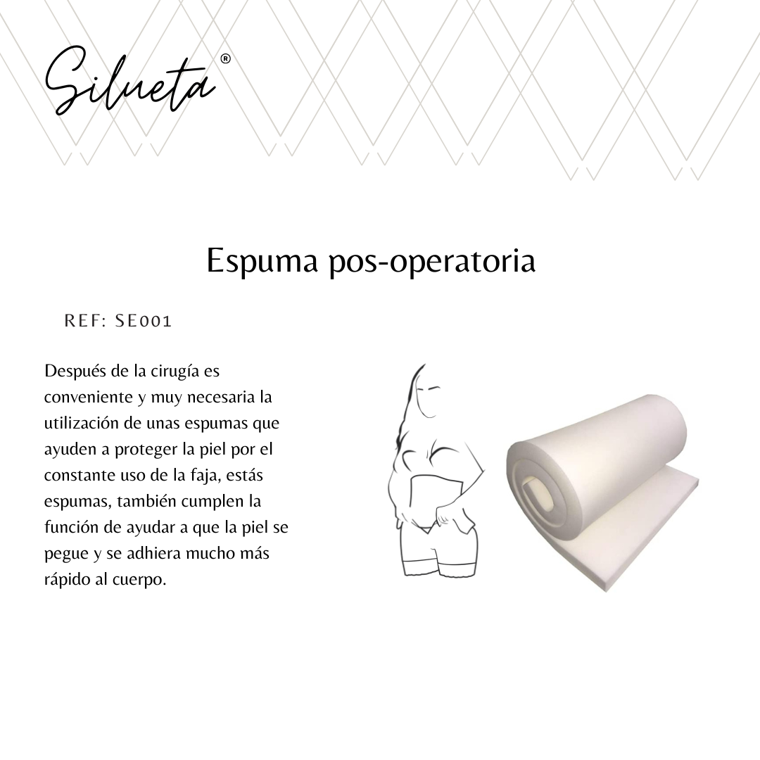 Después de la cirugía es conveniente y muy necesaria la utilización de unas espumas que ayuden a proteger la piel por el constante uso de la faja, estás espumas, también cumplen la función de ayudar a que la piel se pegue y se adhiera mucho más rápido al cuerpo.