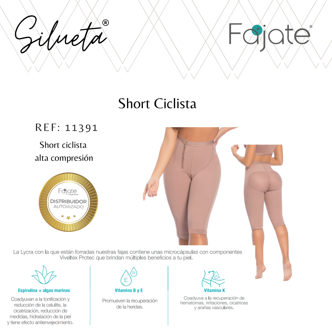 Faja ciclista con mayor cubrimiento hasta la rodilla que define piernas y glúteos, tiro alto que moldea tu torso, cremallera en costado y abrochadura interna que facilita la postura y protege la piel, cuenta con doble refuerzo abdominal para mayor compresión y firmeza, falso perineal para total comodidad, su capacidad en la cola resalta todos los atributos de forma natural y permite que los glúteos se vean más redondeados, realzados y firmes, elástico superior que ayuda a la correcta sujeción, delicado detalla de encaje en la rodilla, Prenda 100 % forrada con lycra que contiene propiedades de microcápsulas que mientras moldea cuida tu cuerpo. Funciona como faja moldeadora de cintura baja y caderas. Su distintivo principal realzar los glúteos y moldear tus caderas.